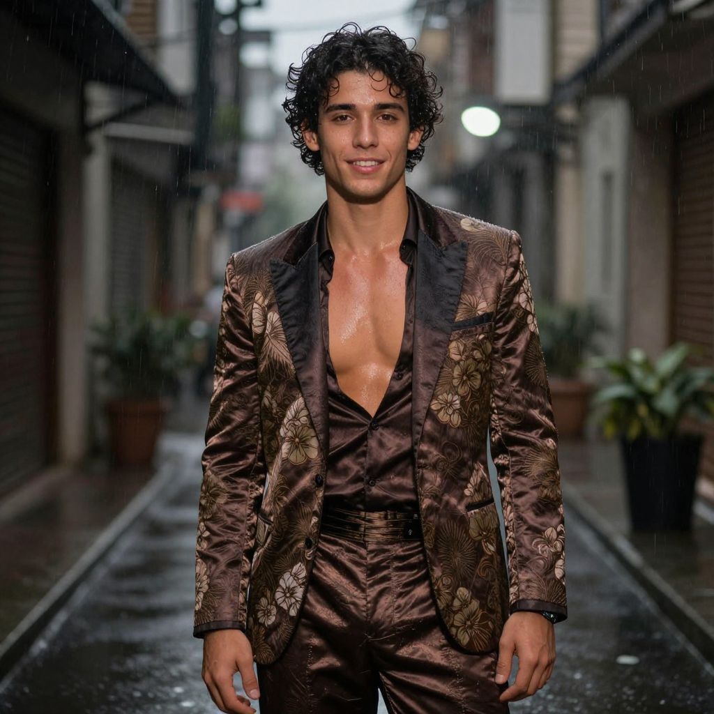Photograph of a curly-haired young man with tan skin, wearing a shiny, patterned brown suit and unbuttoned shirt, standing in a rainy