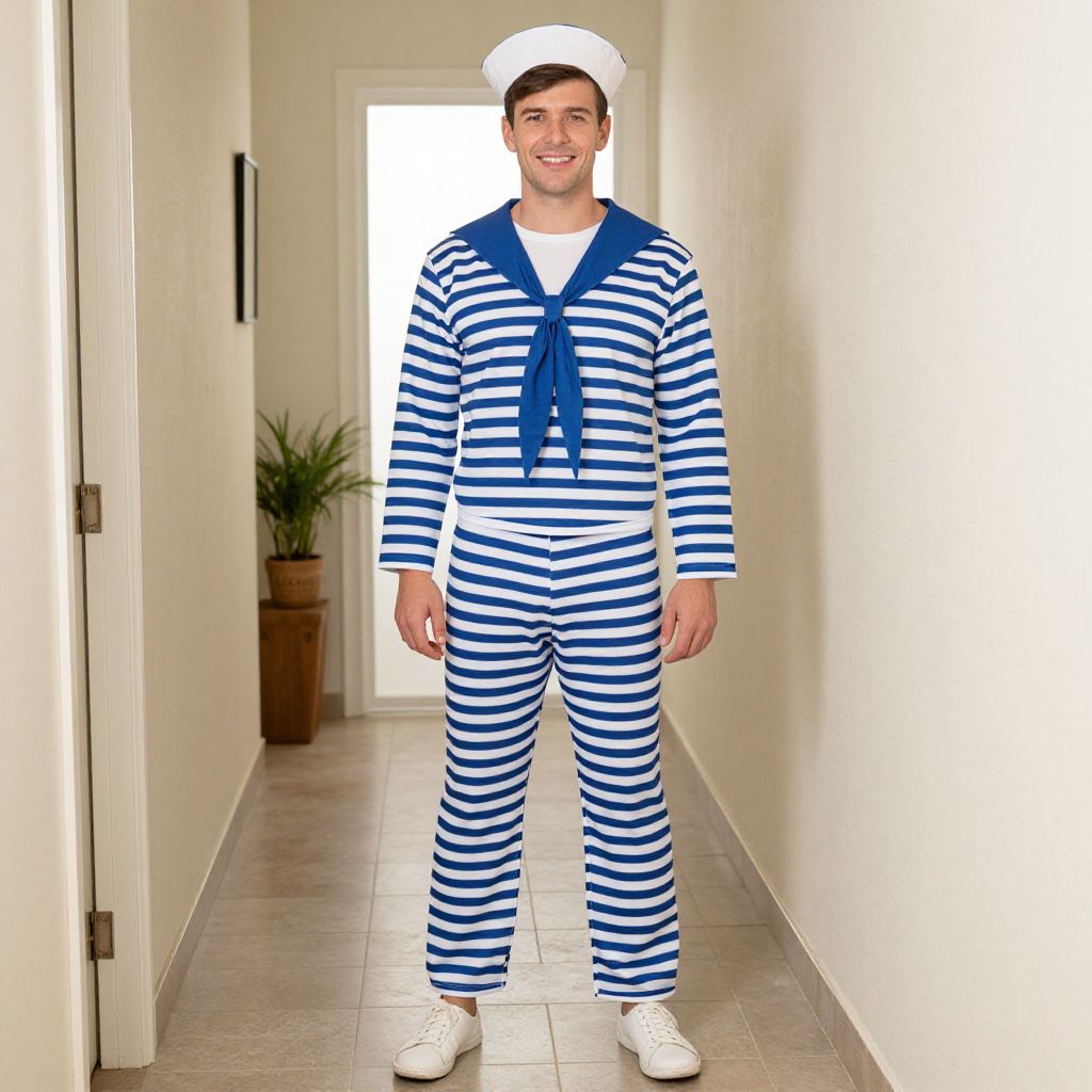 Steve Scoops Ahoy Costume, man in a sailor costume standing in a hallway