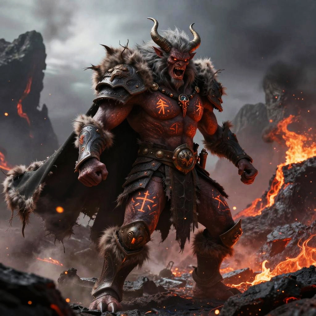 Furry demon warrior in armor with tattered fur cape, glowing symbols etched on body, raging in a volcanic landscape with flying embers, dramatic lighting