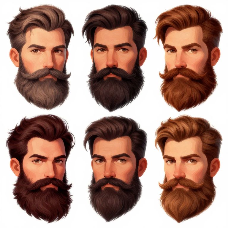 This is a digital illustration featuring six stylized male faces, each with distinct beards and hairstyles, arranged in two rows of three. The men have varying facial features, including dark and light brown hair, full and trimmed beards, and expressive eyebrows. The top row includes a man with a thick black beard and side-parted hair, a man with a dark beard and slightly wavy hair, and a man with a brown, swept-back beard and hair. The bottom row features a man with a full dark beard and voluminous hair, a man with a medium-length beard and neatly combed hair, and a man with a bushy brown beard and tousled hair. The background is plain white, highlighting the detailed, realistic textures of the hair and facial features.