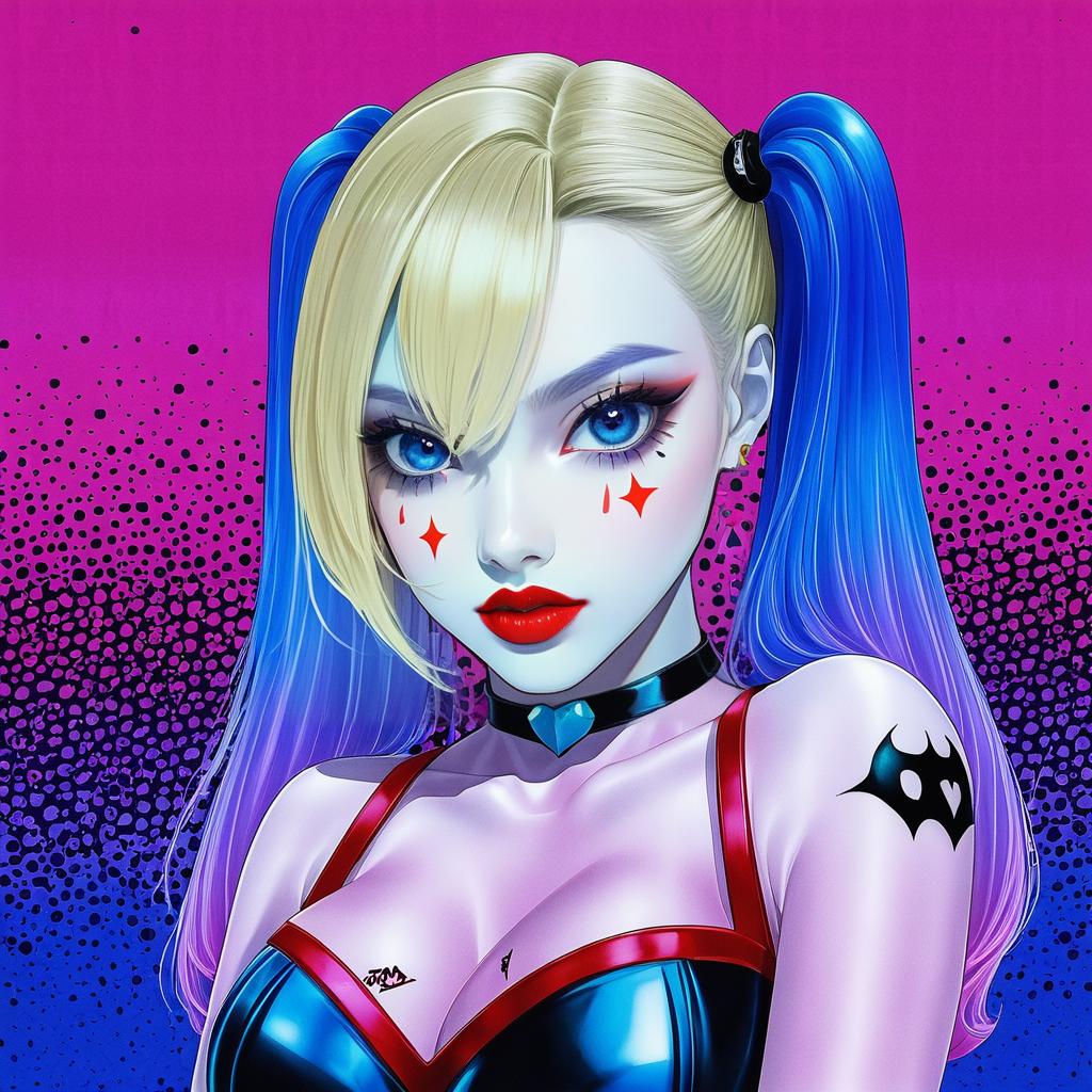 Digital illustration of Harley Quinn from DC Comics featuring a close-up portrait with blonde, blue, and pink gradient twintails. The character has striking blue eyes, red lipstick, and wears a red top with heart symbols, gold choker and bracelet. The artwork highlights a vibrant, stylized anime-inspired look with detailed hair and makeup.