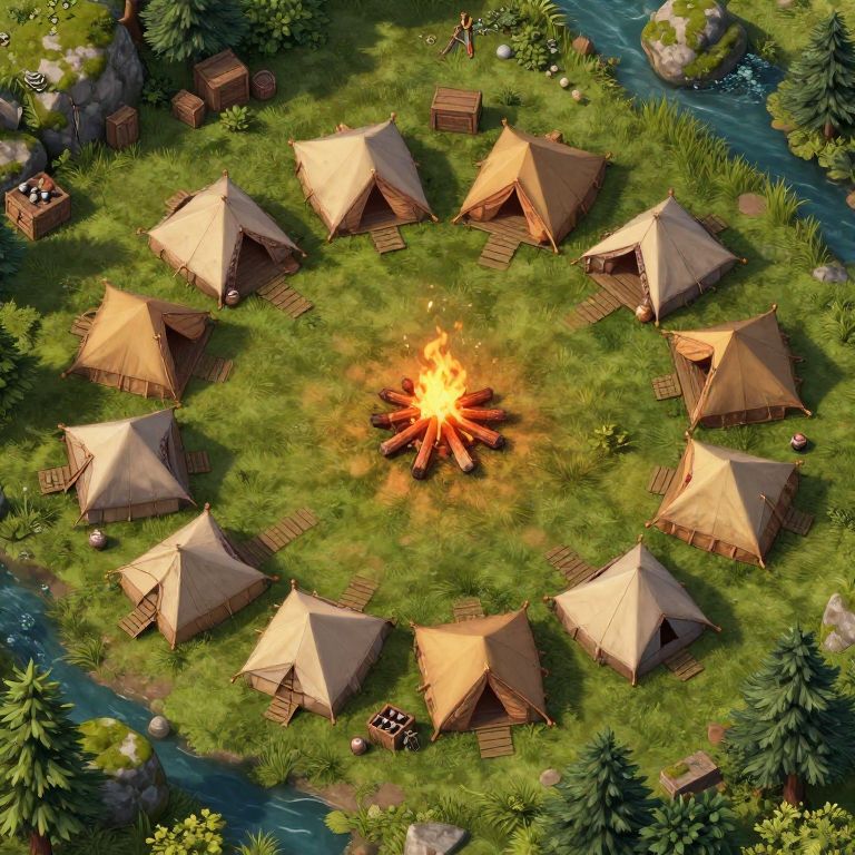 This is a CGI overhead view of a circular campsite in a lush, green forest. At the center is a vibrant, flaming campfire surrounded by a ring of eight beige canvas tents, each with wooden stoves and small tables in front. The campsite is set on a grassy area near a flowing river, with rocks, trees, and more tents visible in the background. The tents are evenly spaced, with a wooden pathway leading to each one, creating a symmetrical arrangement. The image has a realistic, yet slightly exaggerated, cartoon-like style with bright, saturated colors and detailed textures.