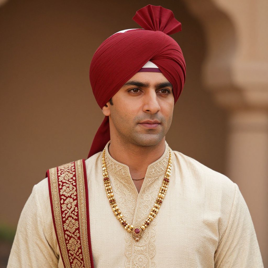Bollywood Dress Man Costume, a close up of a man in a turban and a necklace
