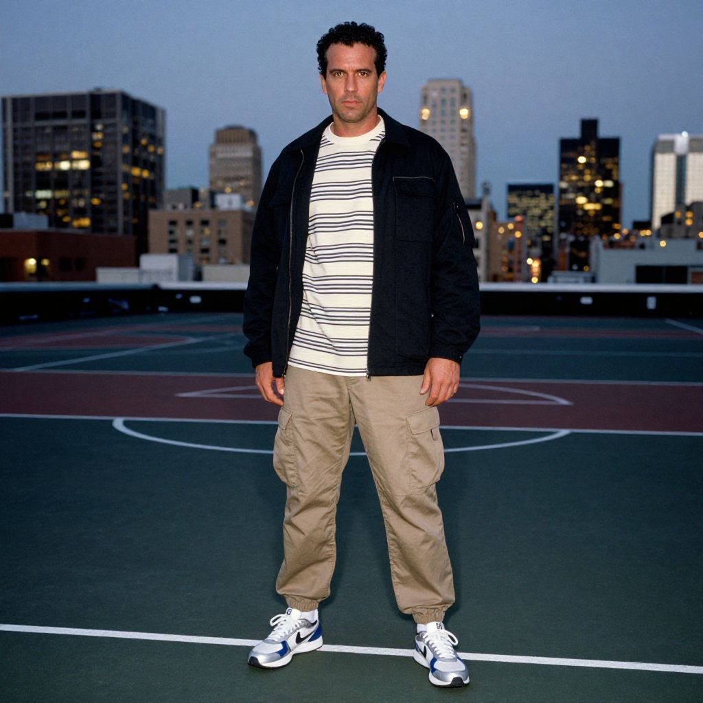 A man, striped thermal shirt in cream and navy, relaxed-fit cargo joggers in khaki, retro running shoes in white and blue, utility jacket in black, urban rooftop courts, skyline view, bright city lights at dusk, Cibachrome style, confident expression.Man has masculine face and piercing eyes