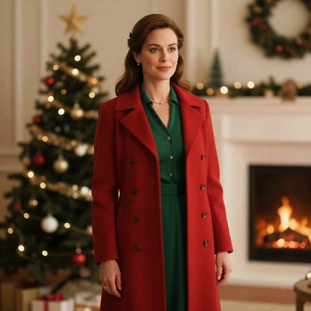 Photograph of a white woman with long brown hair, wearing a red double-breasted coat over a green dress, standing in a warmly lit, Christmas-decorated living room. She has a subtle smile and wears small hoop earrings. Behind her, a decorated Christmas tree with gold and red ornaments and a lit fireplace are visible. A wreath hangs on a white wall to the right. The room has a cozy, festive atmosphere with soft, warm lighting.