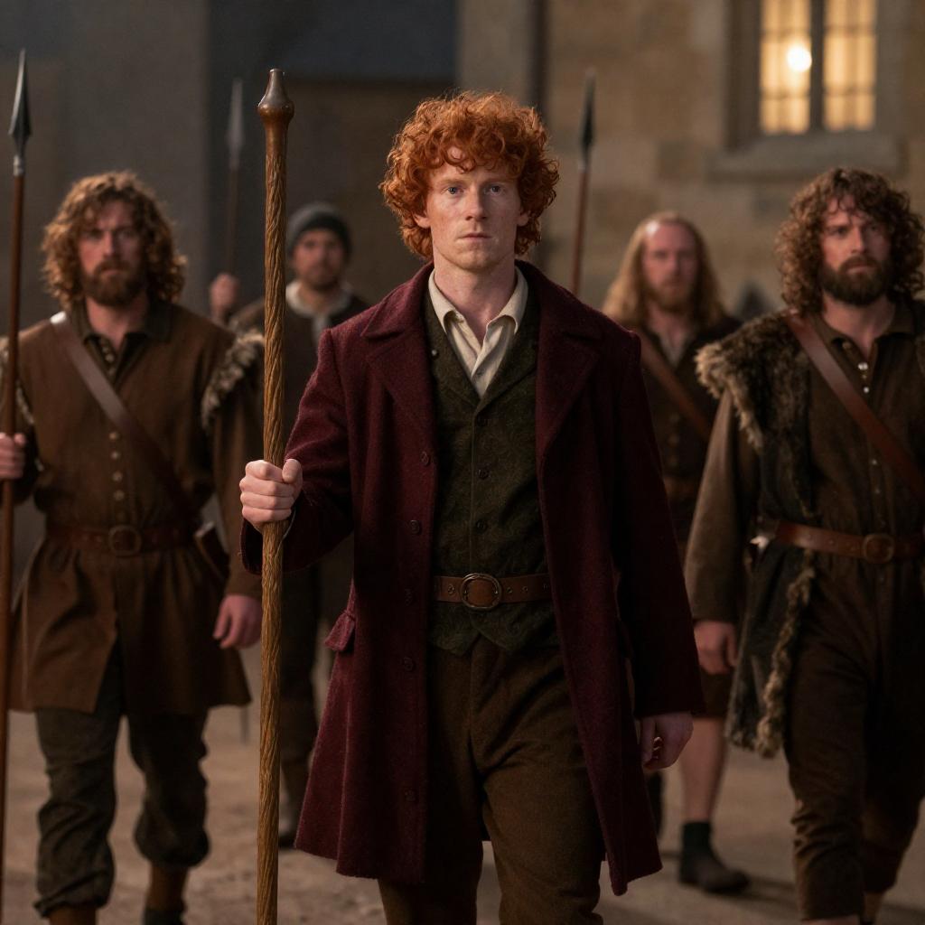 Three men in a dimly lit room. Middle man with long red beard, large black hat, green tunic, and various pouches. Shirtless man on left with muscular build, beard, holding a stick. Shirtless man on right with dark skin, beads, and a belt. Lantern on left, wooden wall. Middle man's intense expression, others neutral.