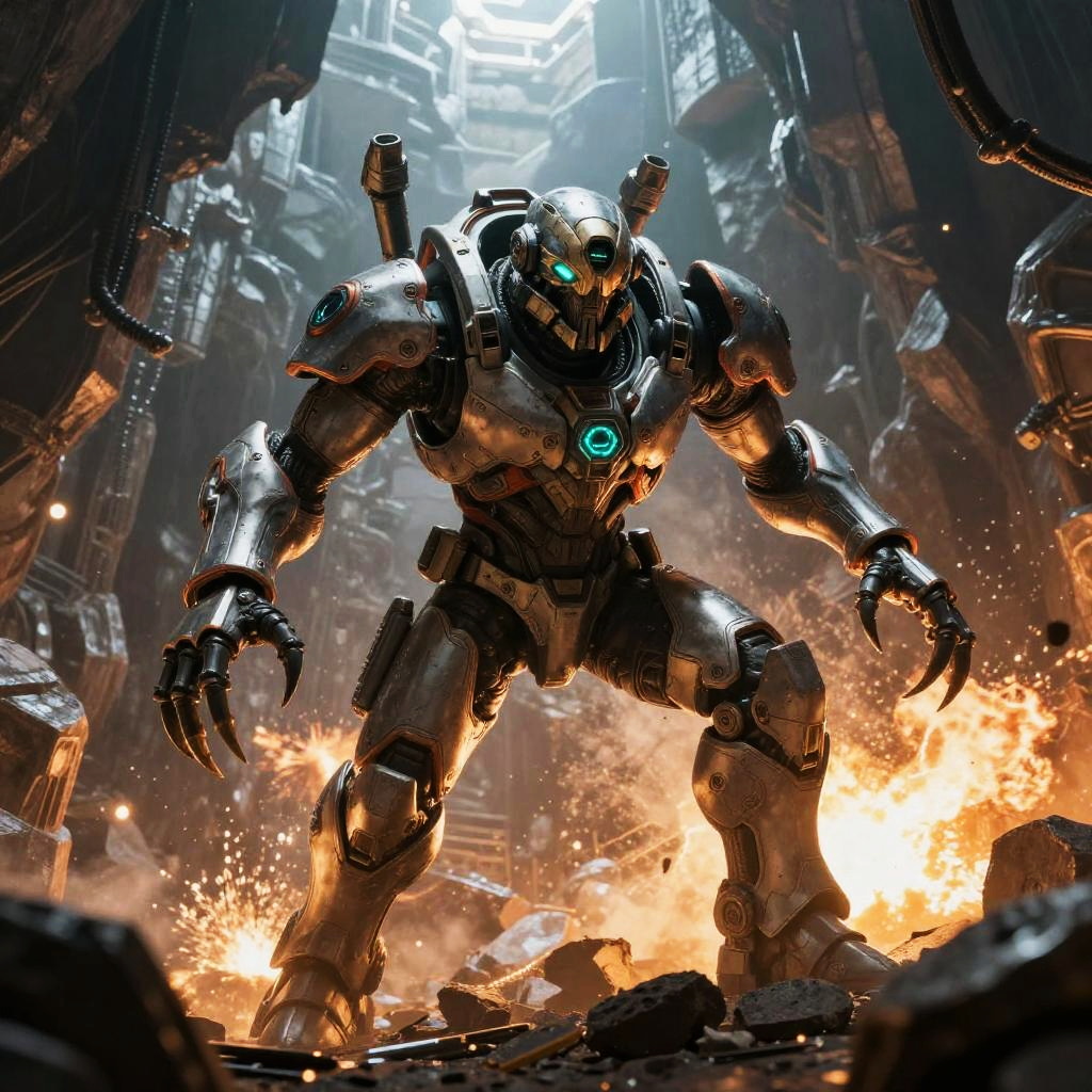 Helldivers 2 Hive Lord emerging from a massive hive cavern, brutal warlord with sharp claws and armored exoskeleton, neon bioluminescent details, intense action scene with explosions