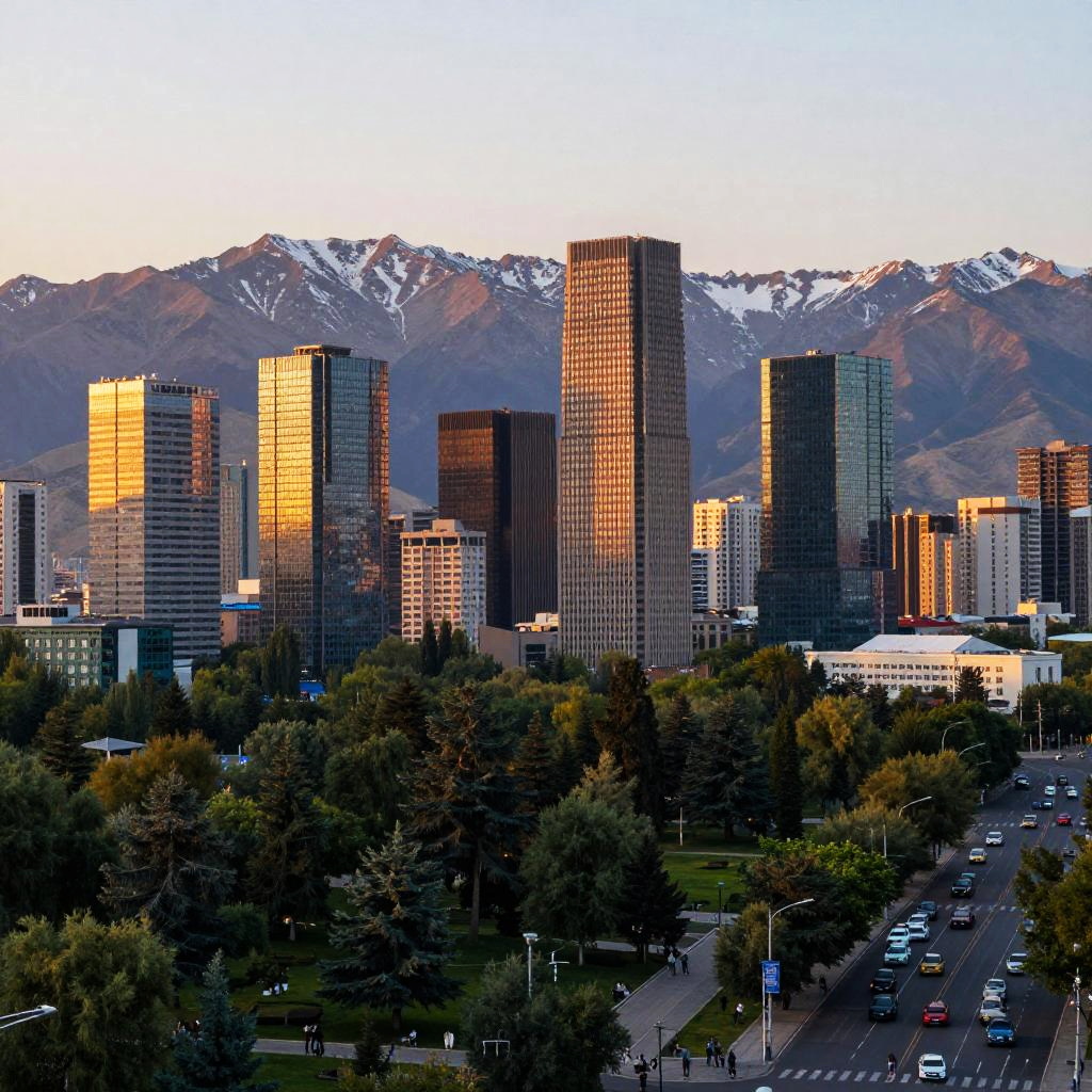 Almaty cityscape at sunset, vibrant urban skyline with towering modern skyscrapers and lush green parks, snow-capped Tian Shan mountains in the background, warm golden light reflecting on glass buildings, bustling streets filled with people and cars, cinematic atmosphere