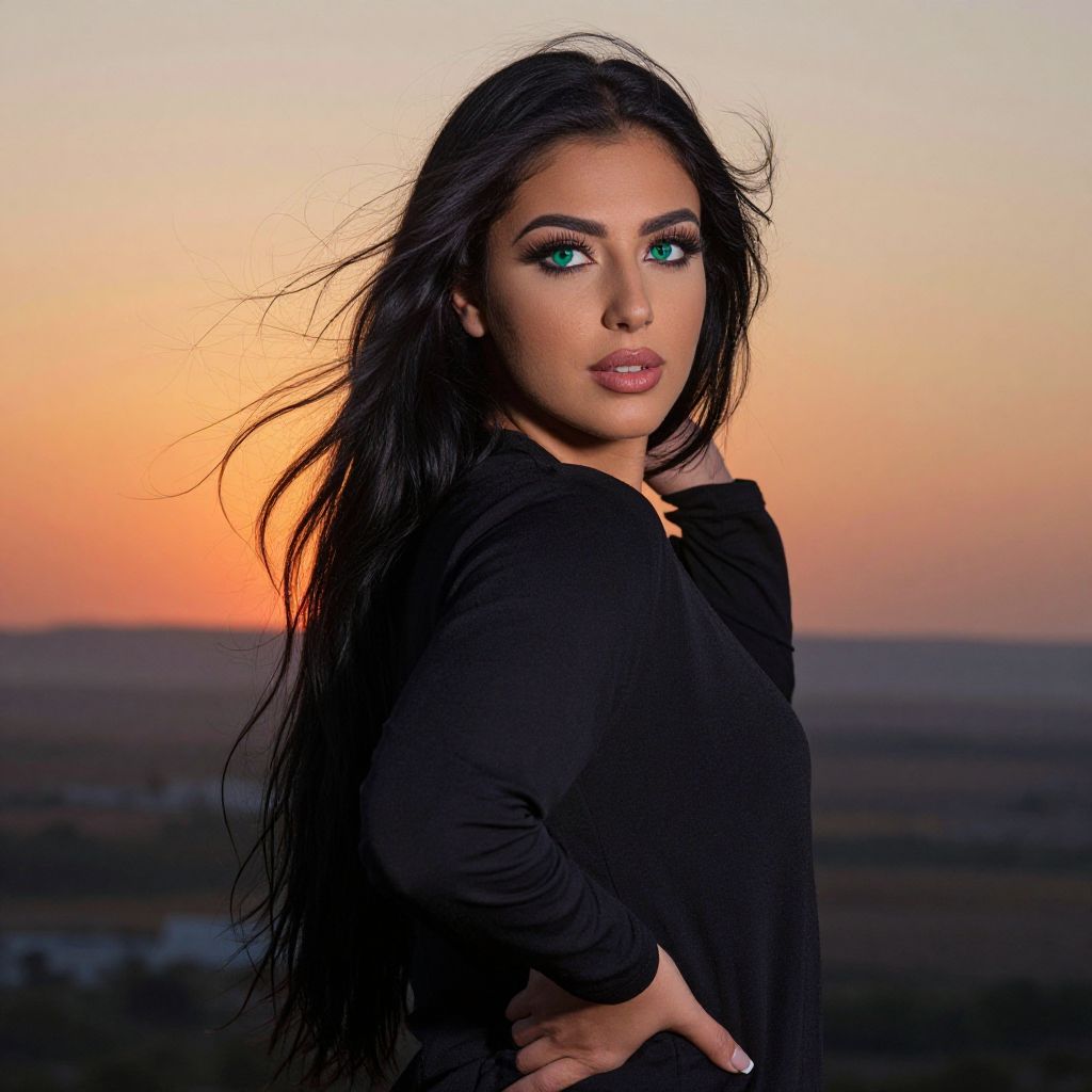 Create an iPhone portrait of a North African woman with raven-black hair flowing down her back, capturing the vibrant hues of sunset as the gentle breeze blows. Her striking emerald eyes, accentuated by long lashes, shift between expressions of intrigue and serenity. Soft yet dynamic lighting casts warm shadows on her prominent cheekbones and rose-tinted lips. The camera captures a candid three-quarter view as she turns slightly away, with an elegant hand resting on her hip. This composition evokes a sense of mystery and grace, set against a softly blurred panoramic landscape—a harmonious fusion of contemporary realism and impressionistic technique.
