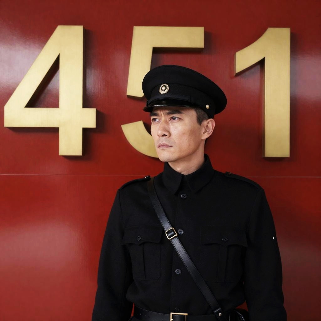 Photograph of a stern-faced man in a black uniform and peaked cap, standing against a glossy red wall with large gold numbers "451" above him. He is positioned slightly to the right, looking to the left. The red wall has a reflective surface. The man's expression is serious and focused.
