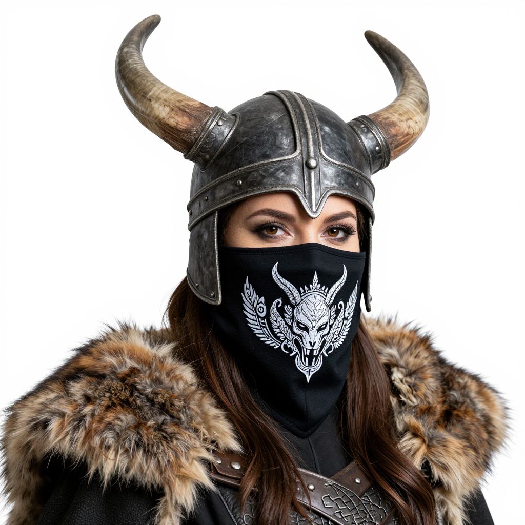 Woman wearing a black face mask featuring a detailed Norse warrior design, including a helmet with prominent horns and a fur-lined cloak, set against a stark white background.
