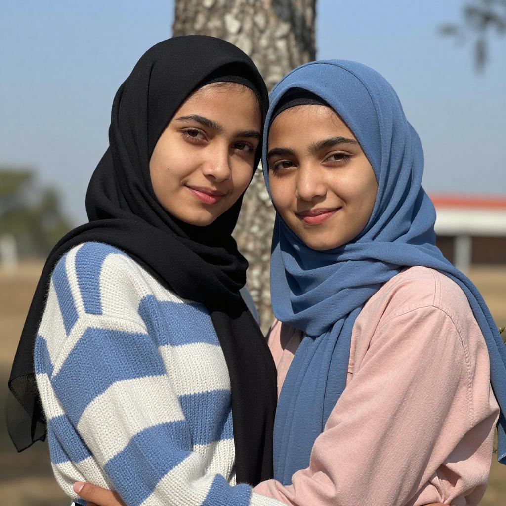 Photograph of two young women with light skin and dark eyes, wearing hijabs. The woman on the left has a white hijab and light blue jacket, smiling softly. The woman on the right has a red hijab and black-and-red jacket, resting her head on the other's shoulder, looking slightly to the side. Background shows blurred trees and snow.