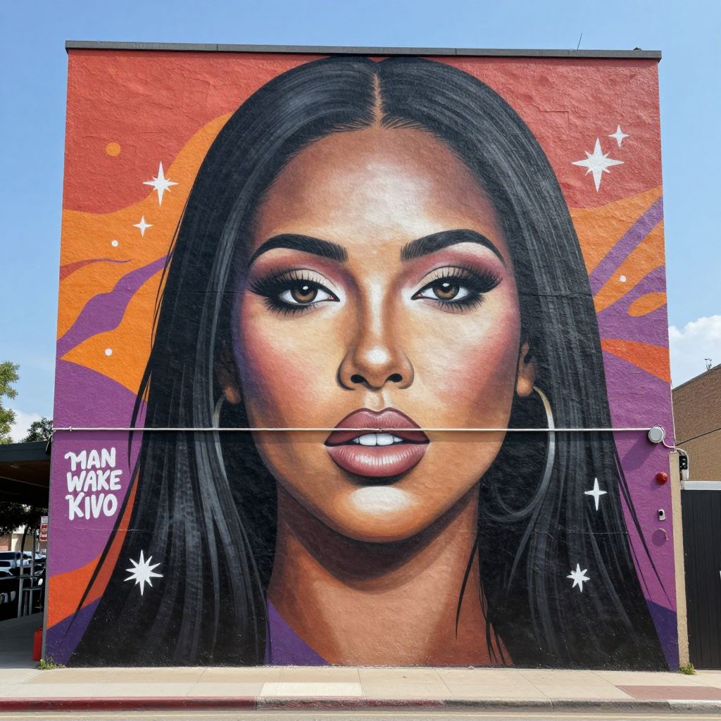 Vibrant street art mural of a beautiful Black woman with long hair, bold makeup, and hoop earrings, against an orange-purple background with stars.