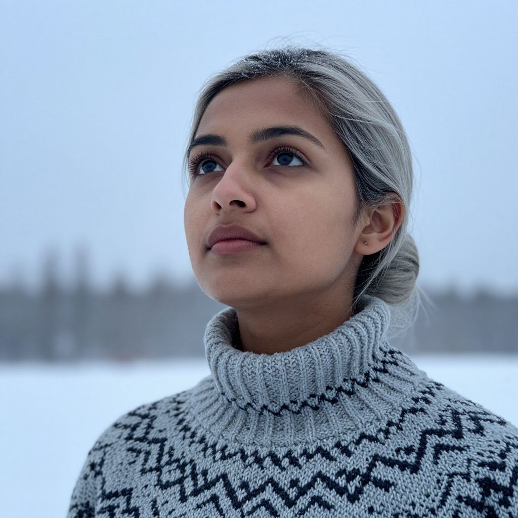 Photograph of a young woman with medium brown skin and black eyes, gazing slightly upward. She has straight, shoulder-length grayish-blonde hair. She wears a thick, knitted, gray and black patterned turtleneck sweater. The background is a blurred, snowy landscape with a pale blue sky and distant, out-of-focus trees. Her expression is calm and contemplative. The texture of the sweater is clearly visible, contrasting with her smooth skin. The overall mood is serene and wintery.