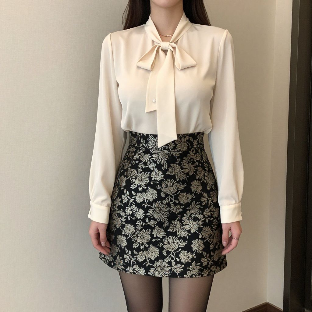 Photograph of an Asian woman in a sunlit garden, wearing a white lace crop top with a bow and beige high-waisted skirt, standing