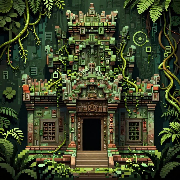 This digital pixel art depicts an ancient, intricately detailed temple facade shrouded in dense jungle foliage. The temple's central entrance is a dark, rectangular doorway flanked by symmetrical windows with grid patterns. The structure is adorned with numerous small, colorful geometric shapes and patterns, including rectangles, squares, and circles, creating a vibrant, mosaic-like effect. Green vines and ferns wrap around the temple, adding a sense of natural overgrowth. The background is a deep, dark green, enhancing the temple's illuminated, pixelated design. The overall style is reminiscent of 8-bit video game graphics, with a rich, intricate texture and a vivid, yet dark color palette.
