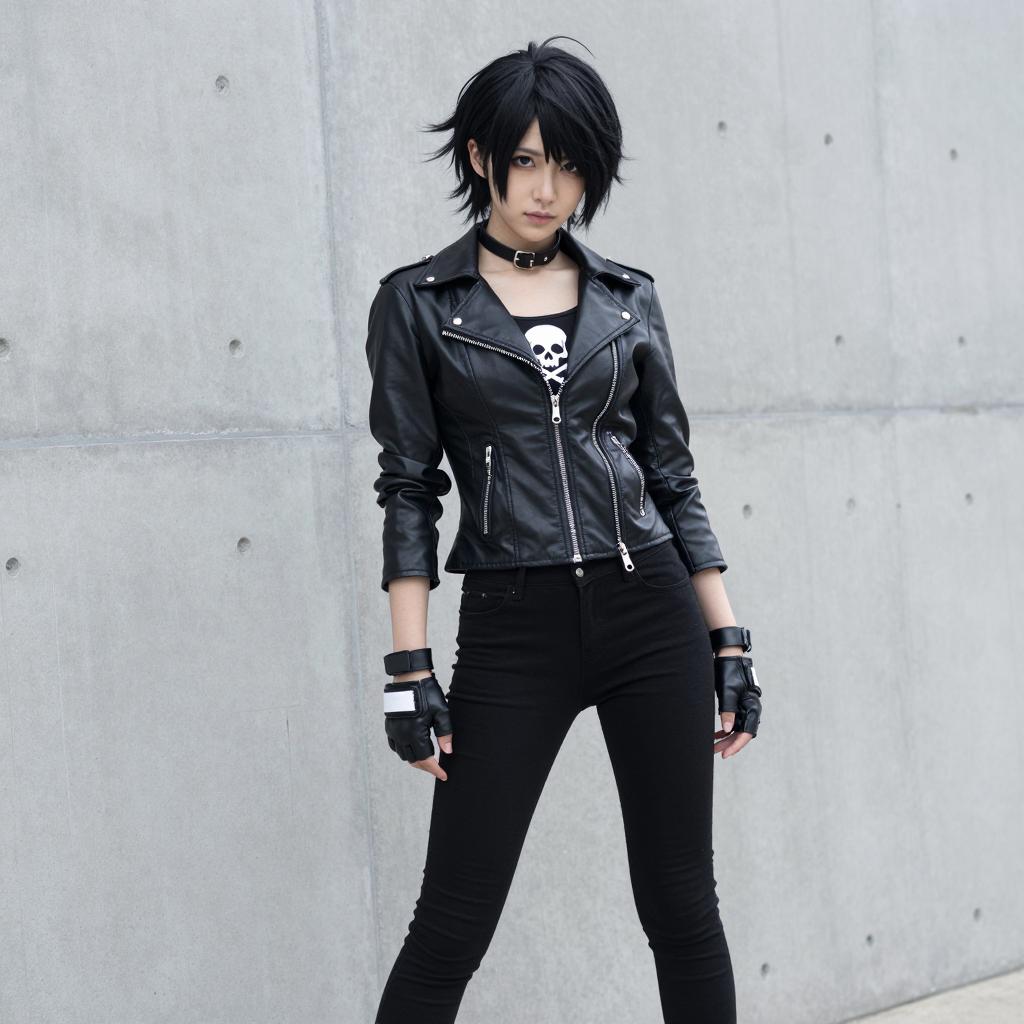 Young female cosplayer with medium-length tousled black hair wearing a fitted black leather jacket featuring a skull and crossbones emblem on a black top underneath. She has on black slim pants and fingerless gloves with white accents, complemented by a black choker and wristbands. Posed confidently against a plain light gray concrete wall, embodying a dark punk and rebellious style.