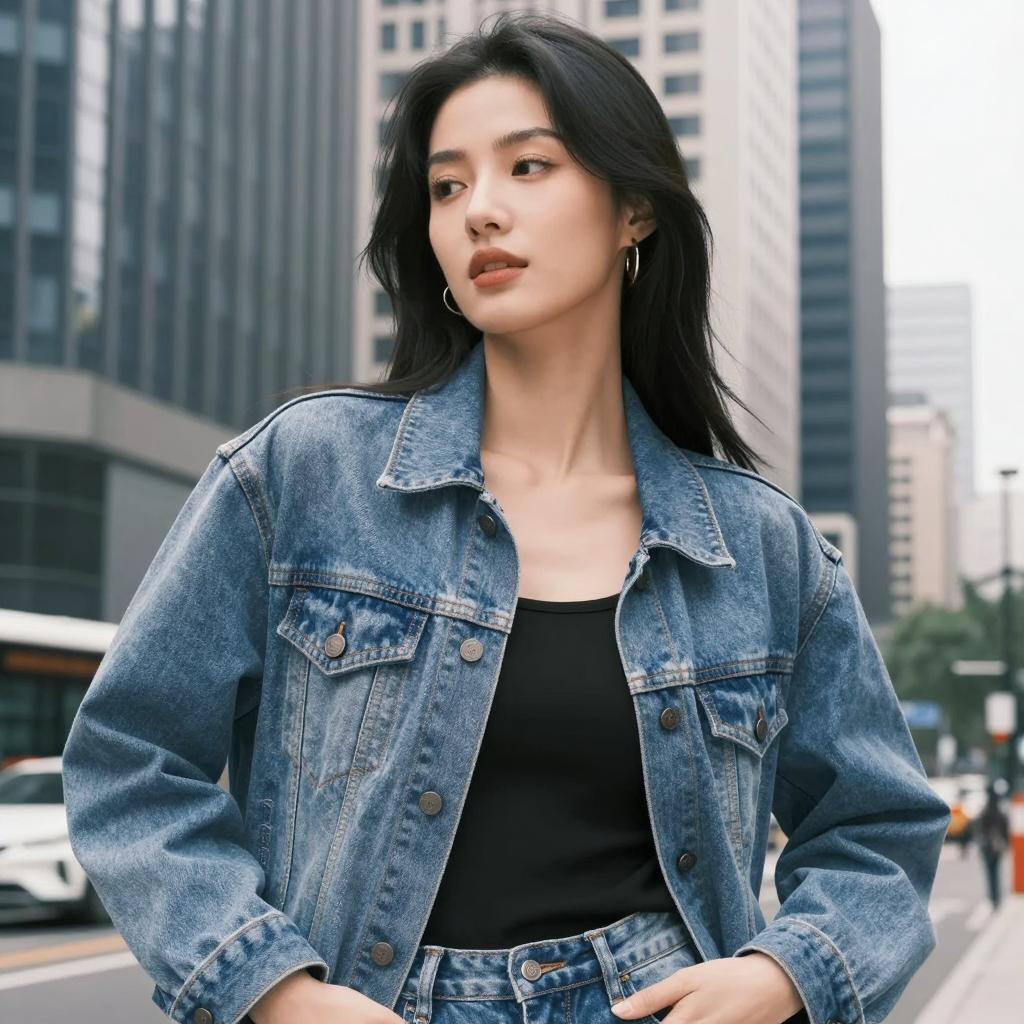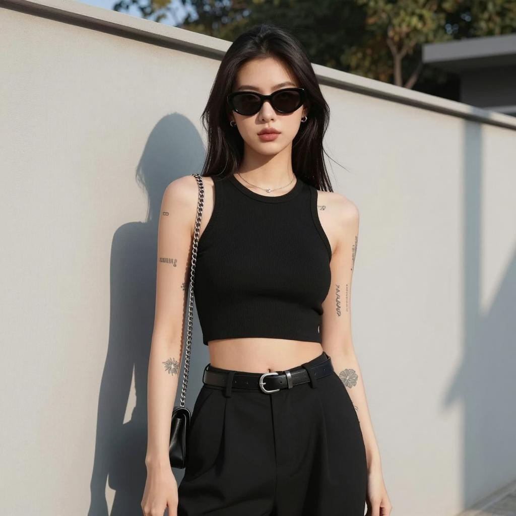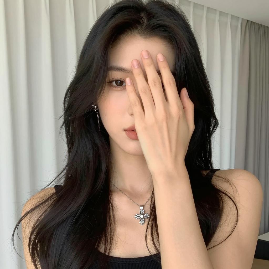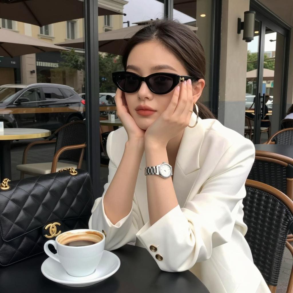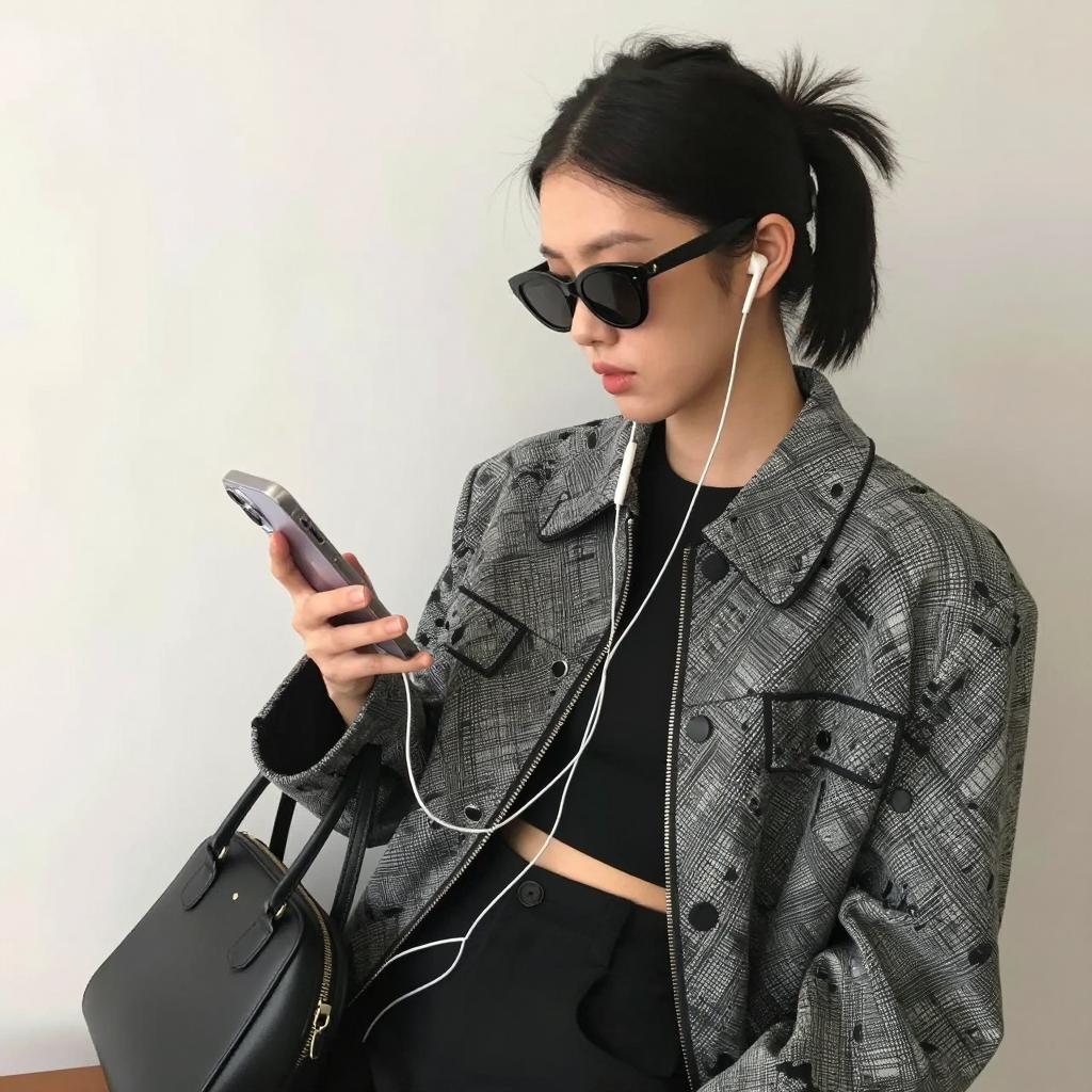 Woman with long black hair wearing dark sunglasses, unbuttoned brown leather jacket, gold necklace, and large hoop earrings. Smoking a cigarette with her head tilted back. Background is a plain white wall. Light ure on the image. Upper body focus. One person.