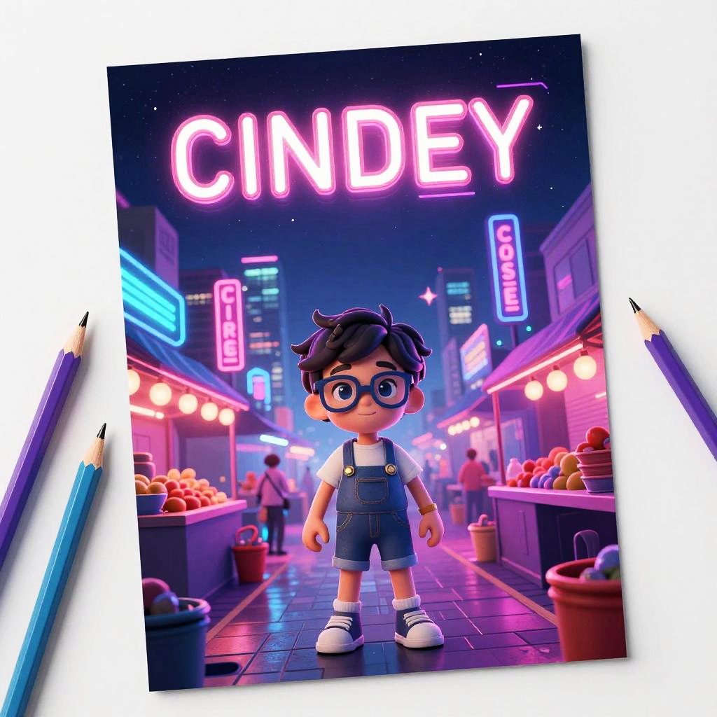 Vaporwave aesthetic, paper, pencils, cyberpunk neon market, urban magic, sky::5 childhood::4, dynamic elements like glasses::-1 freckles::-1 logo::-1 text::-2, no watermarks, high detail.