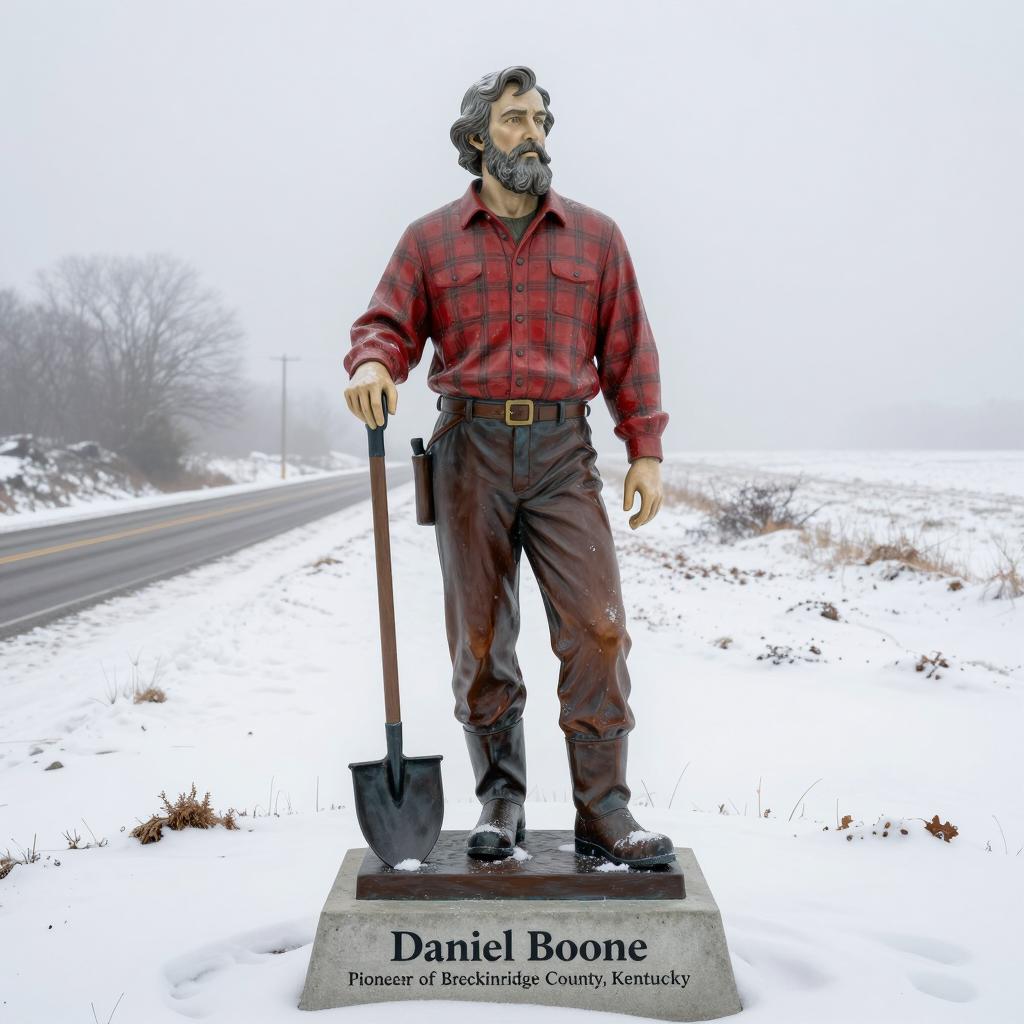 Photograph of a statue of a bearded man in a red plaid shirt, dark pants, and boots, holding a shovel. He stands on a concrete base labeled "Daniel Boone, Pioneer of Breckinridge County, Kentucky." The statue is on a snow-covered road that extends into a foggy, snow-covered landscape.