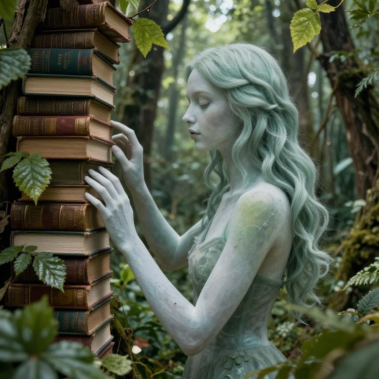 Digital artwork of a pale, ethereal woman with long, wavy, white hair touching a stack of old books in a forest.
