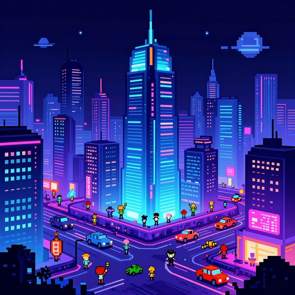 Pixel art AI generator designing a futuristic cyberpunk cityscape at night, neon lights glowing on pixelated skyscrapers, bustling with pixelated characters and vehicles, blending 8-bit charm with advanced digital aesthetics.