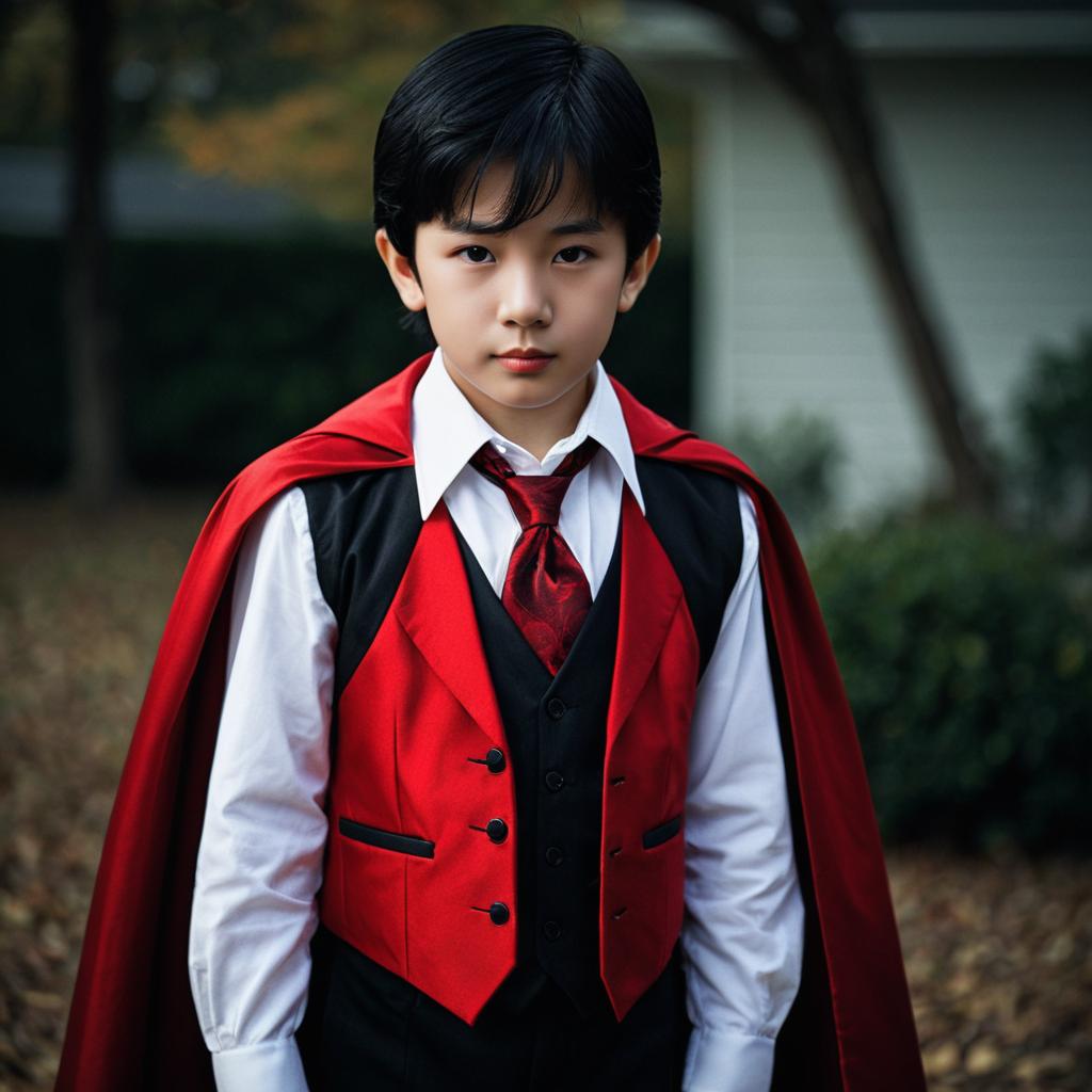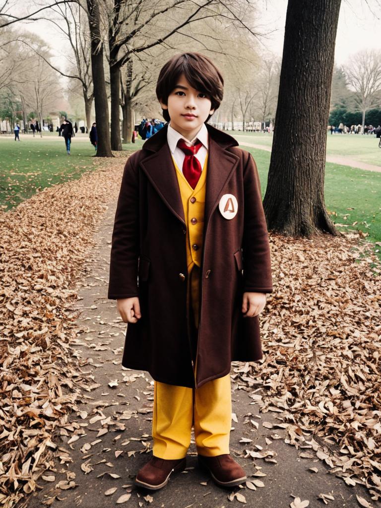 Photo-realistic full body shot of a young boy with brown hair and brown eyes, wearing a brown coat over a yellow suit with a red ascot, cosplaying as Alvin from the Tales series. The boy stands on a leaf-covered pathway in a park with bare trees and green grass in the background, capturing an autumn or early winter setting.