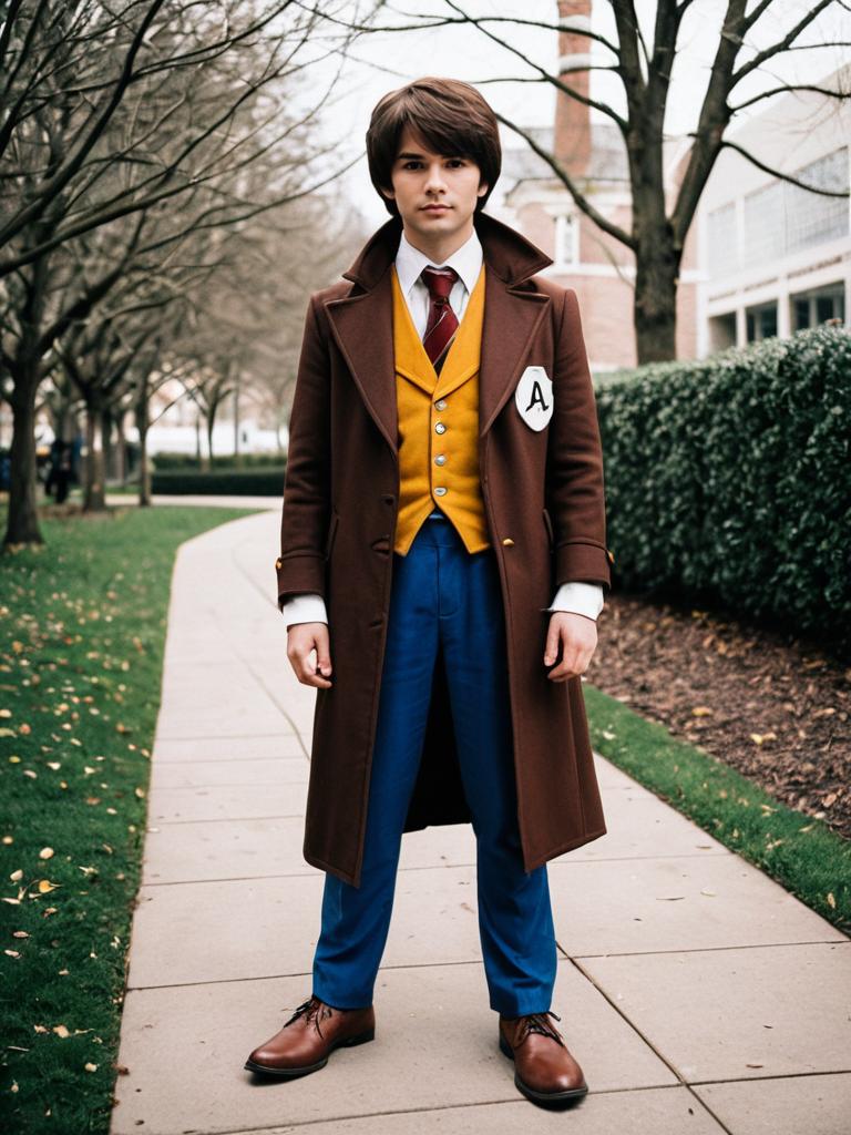 Photo-realistic cosplay photo of person in alvin (tales) costume. 1boy, brown eyes, brown hair, coat, ascot. full body shot