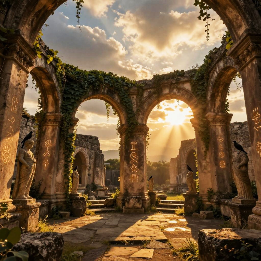 A wide shot over an ancient volcanic crater at sunset, featuring molten lava pools glowing bright orange, flocks of phoenixes rising into the air. Shafts of golden sunlight pierce the clouds. Epic fantasy, drama, mysterious, high resolution, high attention to detail, 8k.
