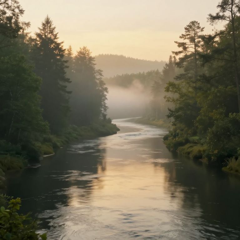 A serene 3D-rendered landscape captures a tranquil river meandering through a misty forest, its waters reflecting the ethereal glow of golden hour light, evoking a sense of timeless beauty and poetic serenity.