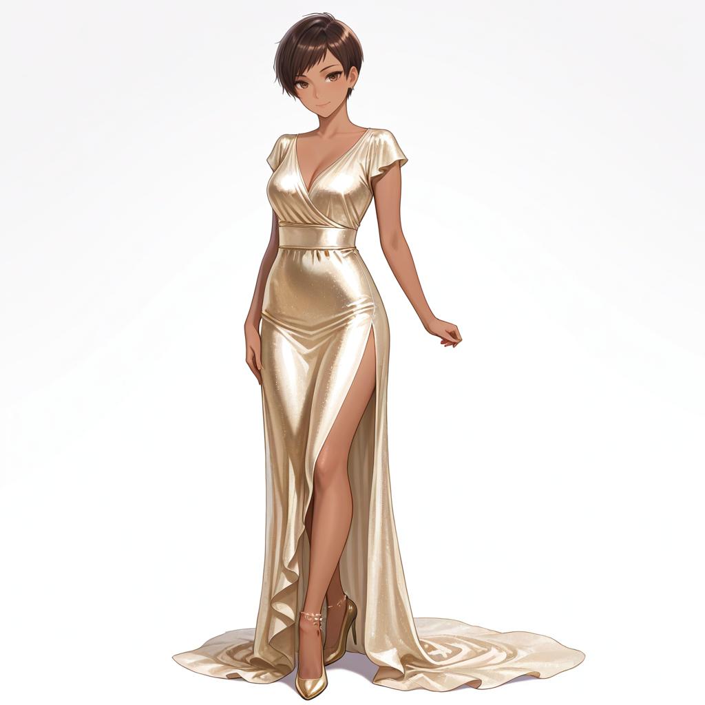 Digital illustration of a stylish young woman with short brown hair wearing a white floor-length gown with a deep V neckline, sheer sleeves, and a high thigh slit. She accessorizes with gold high heels, a gold belt, and gold jewelry, standing confidently on a plain white background.