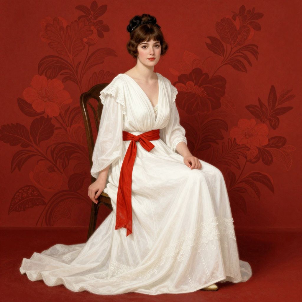 A vintage-inspired digital illustration featuring a woman in a flowing white gown with a red sash, seated gracefully against a bold red floral backdrop, evoking the elegant and romantic style reminiscent of early 20th-century fashion artistry.