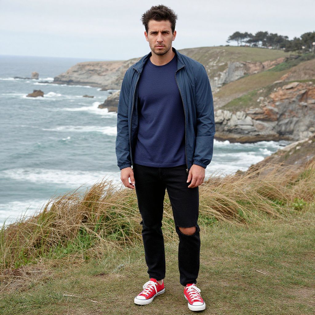 "a man, longline navy blue tee, ripped black tapered jeans, vibrant red low-top sneakers, lightweight windbreaker, relaxed fit, coastal cliffs, wind-swept grasses, ocean waves crashing below, technicolor analog film stock, confident expression Man has masculine face and piercing eyes"