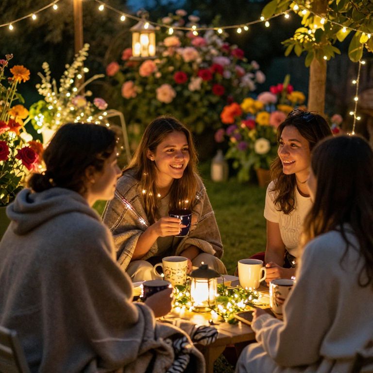 Photograph of four young women laughing and chatting around a glowing outdoor table at dusk. They hold mugs, surrounded by lit string lights and vibrant flowers in the background. One woman with long brown hair in a gray sweater is facing the camera, smiling. The others, with similar long hair and casual clothes, are partially visible. Warm lanterns and greenery add to the cozy, intimate atmosphere. The image captures a joyful, intimate moment with rich, colorful lighting and natural textures.