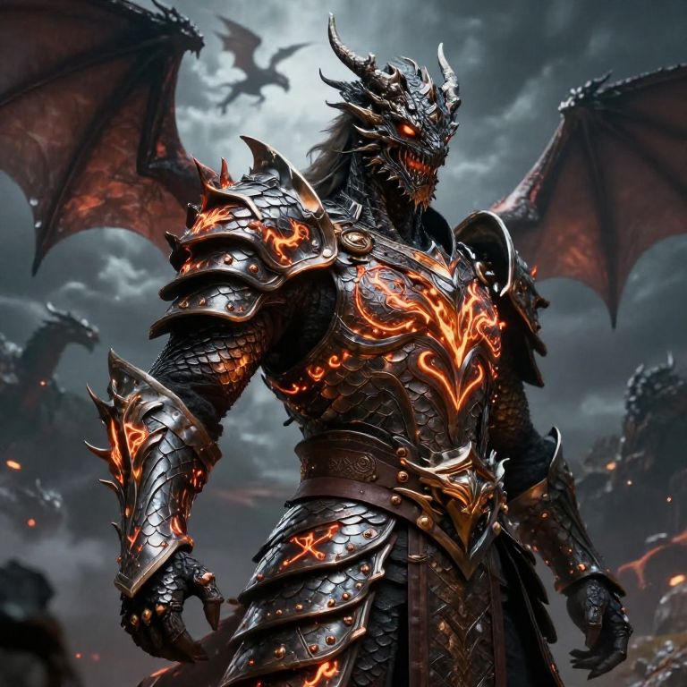 Dragon armor concept art, a fierce warrior clad in intricately designed scales blending metallic and organic textures, glowing with fiery runes, set against a dark fantasy backdrop with dragons soaring in a stormy sky, cinematic lighting and epic detail.