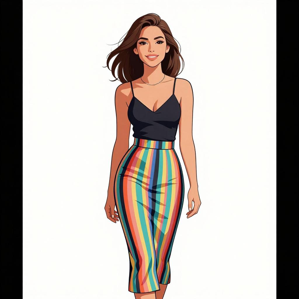 Digital illustration of a smiling woman with long brown hair, wearing a black spaghetti strap top and colorful striped pencil skirt, standing against a white background.