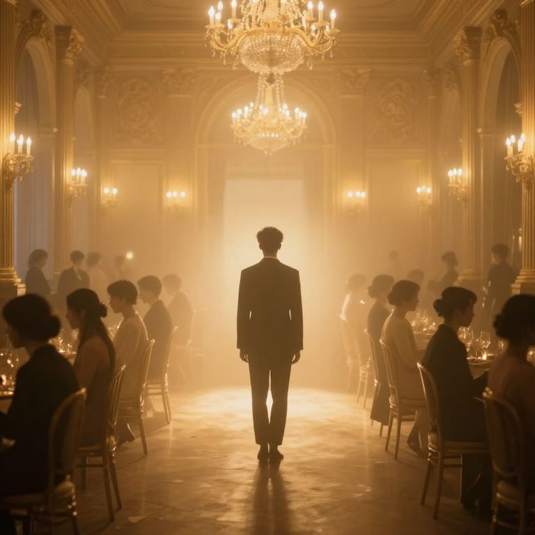 In an opulent ballroom bathed in golden light, a solitary figure stands at the center, surrounded by a crowd of guests whose forms blur into an ethereal haze, as if caught in a timeless, dreamlike trance.