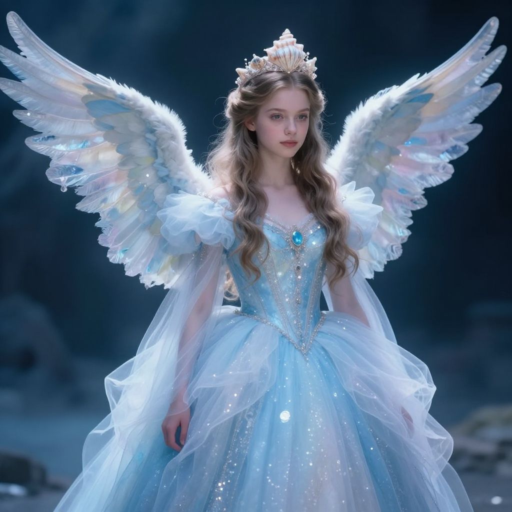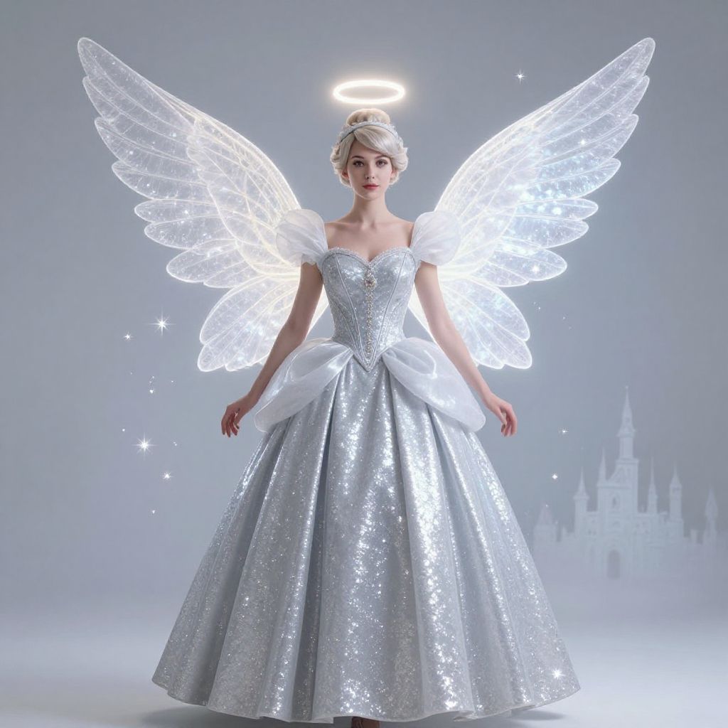 A cinderella story angel costume featuring a shimmering silver dress, large luminous wings, glowing halo above, sparkles floating in the air, soft misty background with a castle silhouette, magical realism art style with elegant details