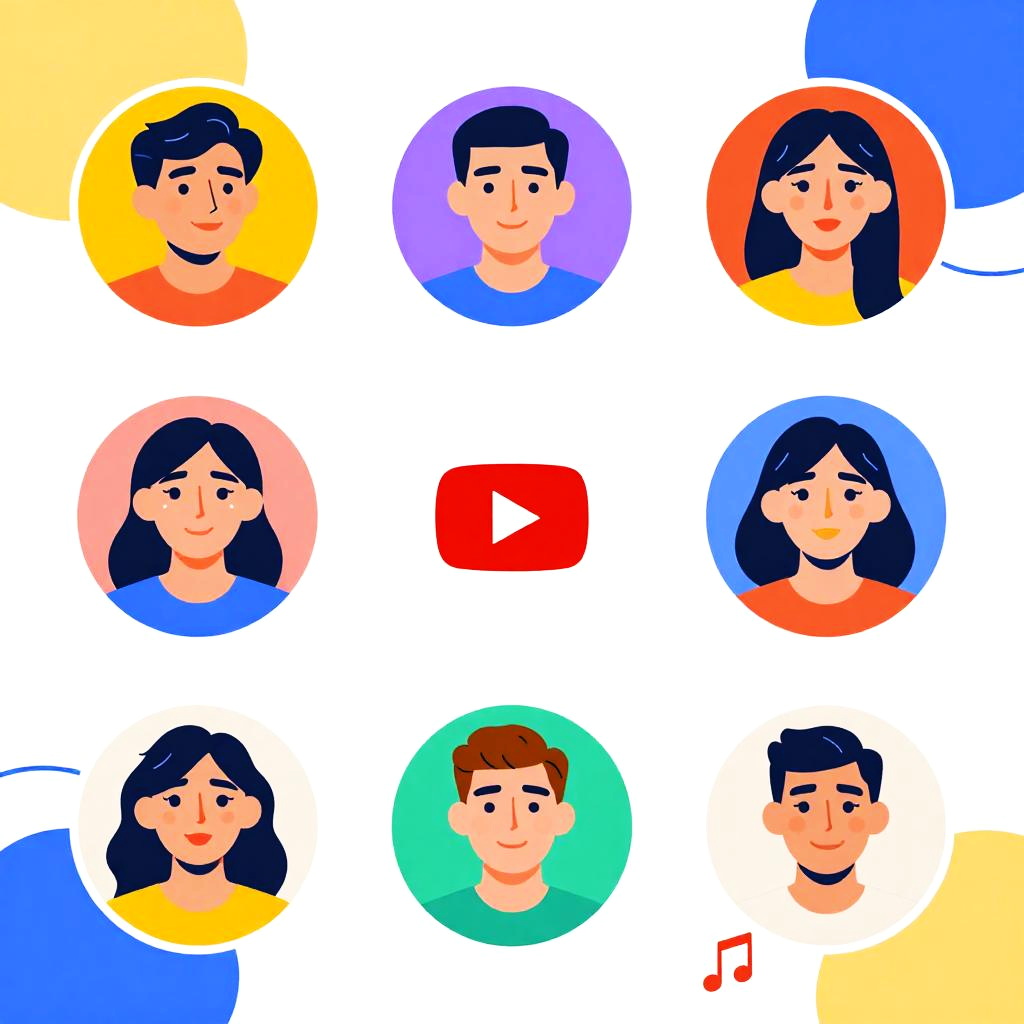 Cool YouTube profiles showcasing trendy, minimalistic illustrations of content creators with expressive faces, bold color palettes, and modern typography, surrounded by abstract shapes and multimedia icons symbolizing video, music, and streaming.