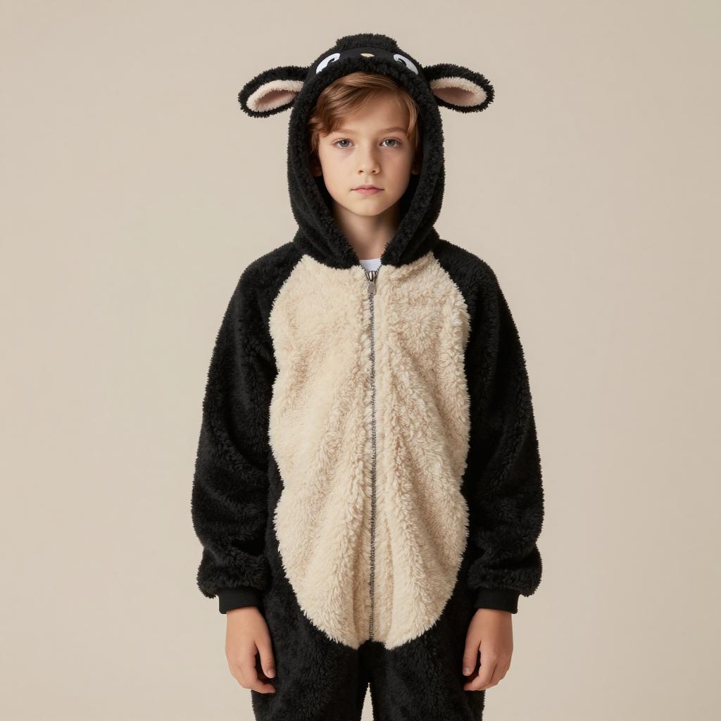 Jurassic park wagon costume, photorealistic portrait of a young boy wearing a realistic, brown and green fantasy-themed hoodie with a large, open-mouthed, dragon-like head, green sleeves, brown straps, brown belt, backpack straps, light gray background, soft lighting, centered, neutral expression, slightly pale skin, blue eyes, freckles, light brown hair, realistic ures, detailed costume, CGI, fantasy attire, realistic clothing style