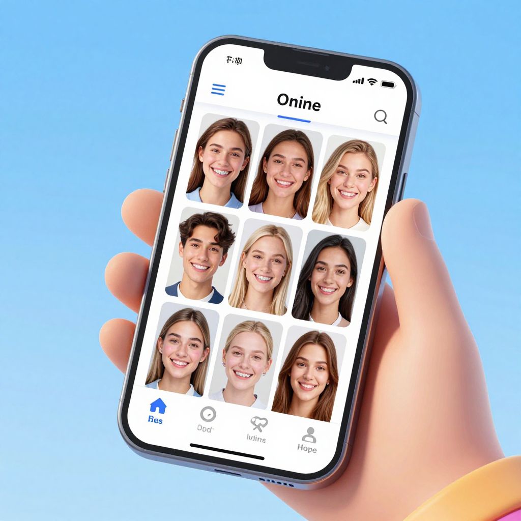 Free braces filter online, realistic 3D render of a smartphone screen showing an app applying braces filter on various faces, smooth UI, bright appealing colors, modern graphic user interface, fresh and youthful energy