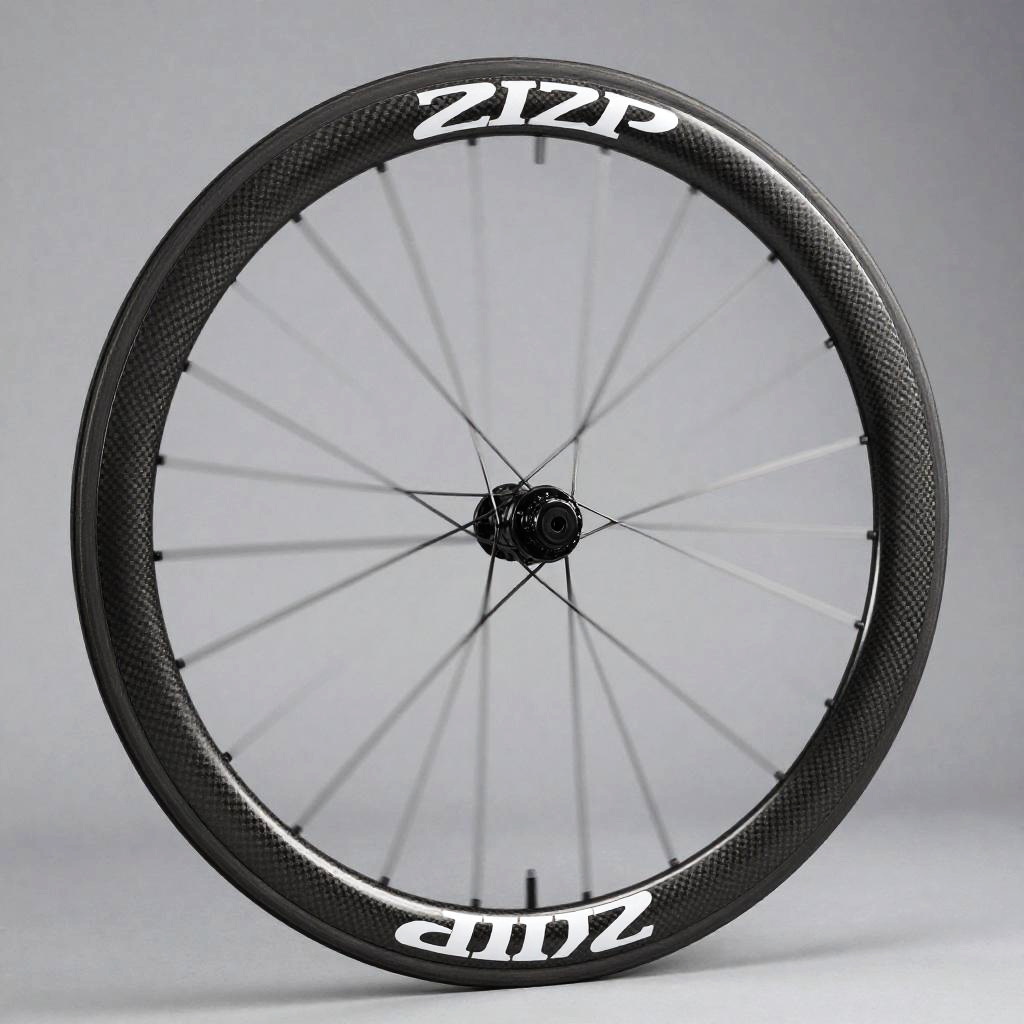Zipp aerodynamic bicycle wheel close-up, detailed carbon fiber texture, spinning rapidly, illuminated by soft studio lighting, sharp shadows and highlights emphasizing intricate engineering and sleek design, minimalistic futuristic aesthetic.