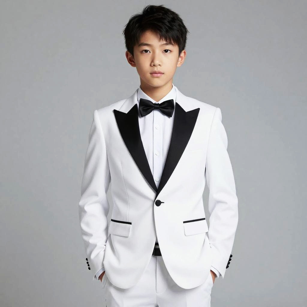 Photograph of an Asian teenage boy with short black hair, standing against a plain gray background. He's wearing a sharp white tuxedo with black lapels and a black bow tie, looking confidently at the camera. His hands are casually tucked into his pants pockets. The lighting is even, highlighting the formal attire and his clean, neat appearance.