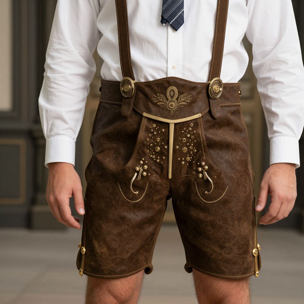 Photograph of a man's midsection, focusing on his chest to mid-thigh. He wears brown leather shorts with intricate gold embroidery and buckles, and a white long-sleeved shirt with a navy blue tie. The shirt is slightly loose, and his hands are relaxed by his sides. The background is out of focus, featuring dark wooden paneling and a tiled floor, suggesting an indoor setting. The leather shorts have a textured, worn look, with ornate details on the front pockets and waistband. The image has a realistic, slightly stylized CGI feel.
