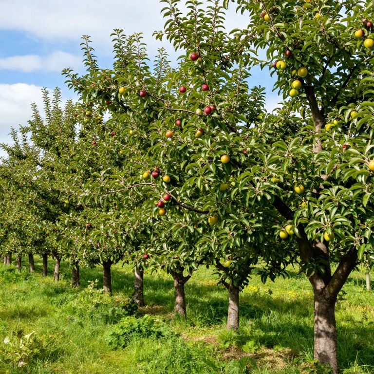 Apple tree laden with ripe fruits under a blue sky, panoramic view of lush orchard in spring, detailed leaves and bark textures, soft sunlight filtering through branches, vibrant and lively nature scene.