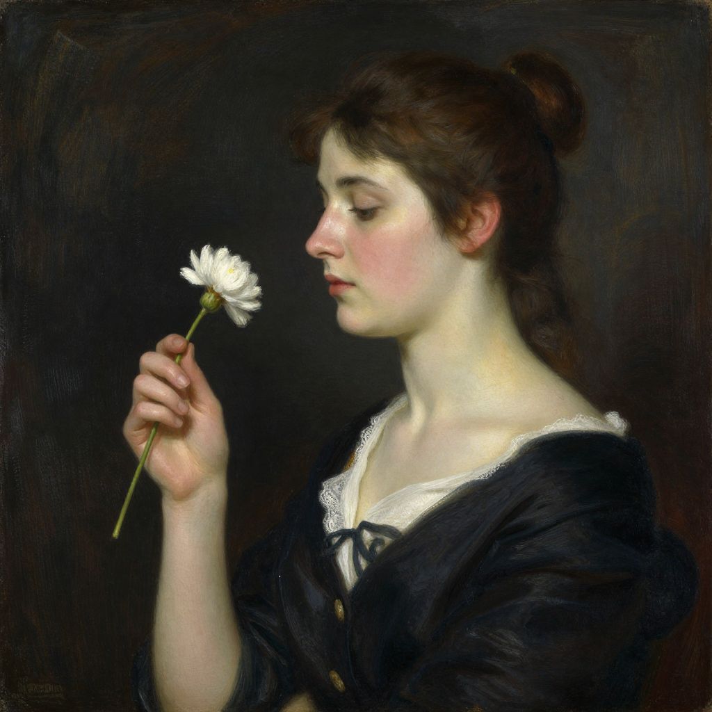 Photorealistic painting of a fair-skinned woman with dark hair in a bun, holding a white daisy, wearing a navy blouse, against a