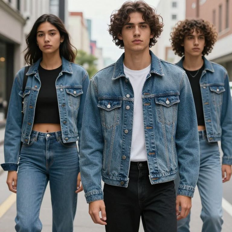 Photograph of three women walking down a wet, cobblestone street in a bustling outdoor market. The two women on the left wear blue denim jackets and flared jeans, with the left one having curly red hair and the right one having curly dark hair. The woman on the right wears a colorful tie-dye shirt and blue jeans. The background features blurred market stalls with red and white umbrellas and various people in casual attire. The scene is vibrant with a mix of urban and bohemian styles.