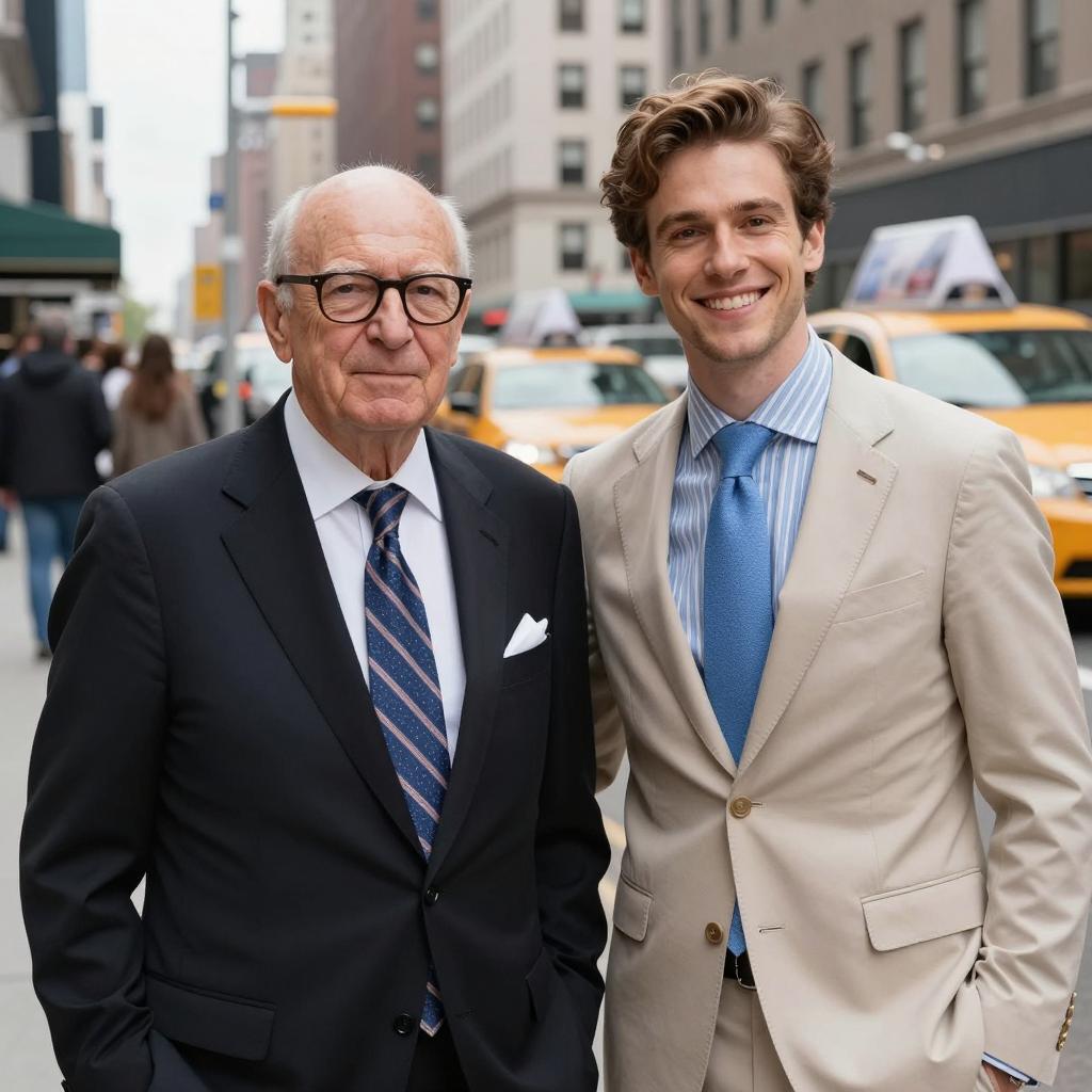 Two men sitting outdoors. Older man with white hair, glasses, brown suit, white shirt, and tie, seated left. Younger black man with afro, black suit, white shirt, and tie, leaning on stone wall, smiling, right. Background: stone wall, tree, lake, mountains. Overcast sky.