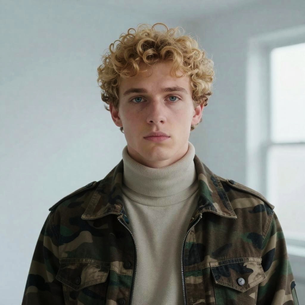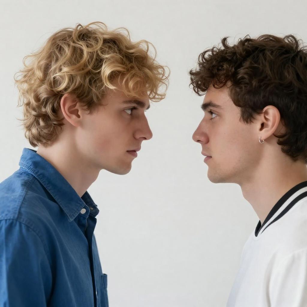 Side profile of two young men facing each other with intense expressions. The man on the left has blonde curly hair and is wearing a blue shirt. The man on the right has dark brown curly hair, a small hoop earring, and is wearing a white shirt with a black and white striped collar. The background is plain and neutral.