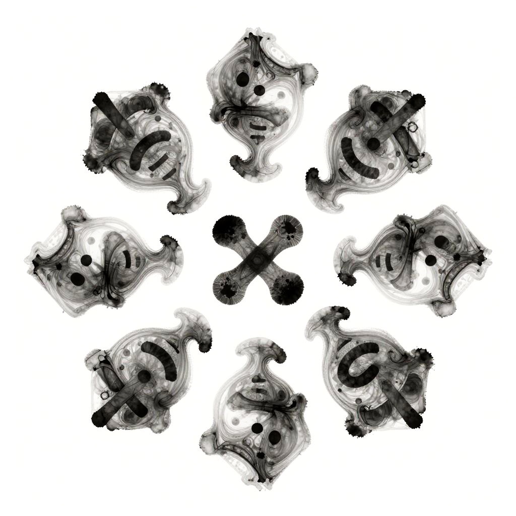Art:bxlmgvv_ees= minimalist yet expressive artwork depicting swirling ink patterns morphing into faces and symbols, utilizing monochromatic shades with strategic splashes of color to evoke emotion and mystery